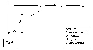 Si deve al filosofo americano Charles S. Peirce una concezione del triangolo semiotico più vicino al modello delle comunicazioni di massa. Peirce introduce l'elemento dell'interpretante, mentre definisce il segno representamen, cioè "qualche cosa che sta per qualcos'altro sotto qualche aspetto o capacità". Il segno, poi, sta per qualcosa non in tutti i rispetti, ma in riferimento a un ground, un fondamento condiviso. L'interpretante è la rappresentazione ulteriore dello stesso oggetto o significato. Ad esempio, sarà il medico a cogliere il rapporto tra il segno "macchie sulla pelle" e la malattia "morbillo". Proprio la parola "morbillo" è l'interpretante del segno. Per conscere il significato di un segno, infatti, dobbiamo affidarci a un altro che lo interpreti. L'interprete, però, non è da confondersi con l'interpretante. Scrive Peirce che "mentre l'interprete è colui che coglie il legame tra significante e significato, l'interpretante è un secondo significante che evidenzia in che senso si può dire che un certo significante veicola un certo significato". Peirce arriva così a un concetto di significato del segno che porta a una semiosi illimitata, vale a dire a un processo di significazione del segno che continua a riprodursi. Un concetto quanto mai adeguato alle comunicazioni di massa, nelle quali c'è una continua circolazione di segni che si traducono in altri segni. Il modello è quello proposto da Volli (2003) (fig. 4):