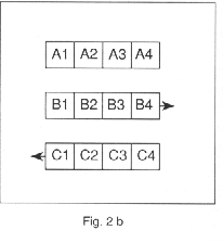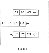 Una serie si muove dall'estremità dello stadio e l'altra in senso inverso dalla metà dello stadio verso quell'estremità. Nella posizione iniziale (fìg. 2a) B3 e B4 sono in corrispondenza di A1 e A2, mentre C1 e C2 sono in corrispondenza di A3 e A4. Ci dovrebbe essere un momento in cui ciascuna massa di una serie sarà allineata con la massa corrispondente delle altre due serie, sicché gli estremi A1-B1-C1 e A4-B4-C4 combaceranno (fìg 2b).